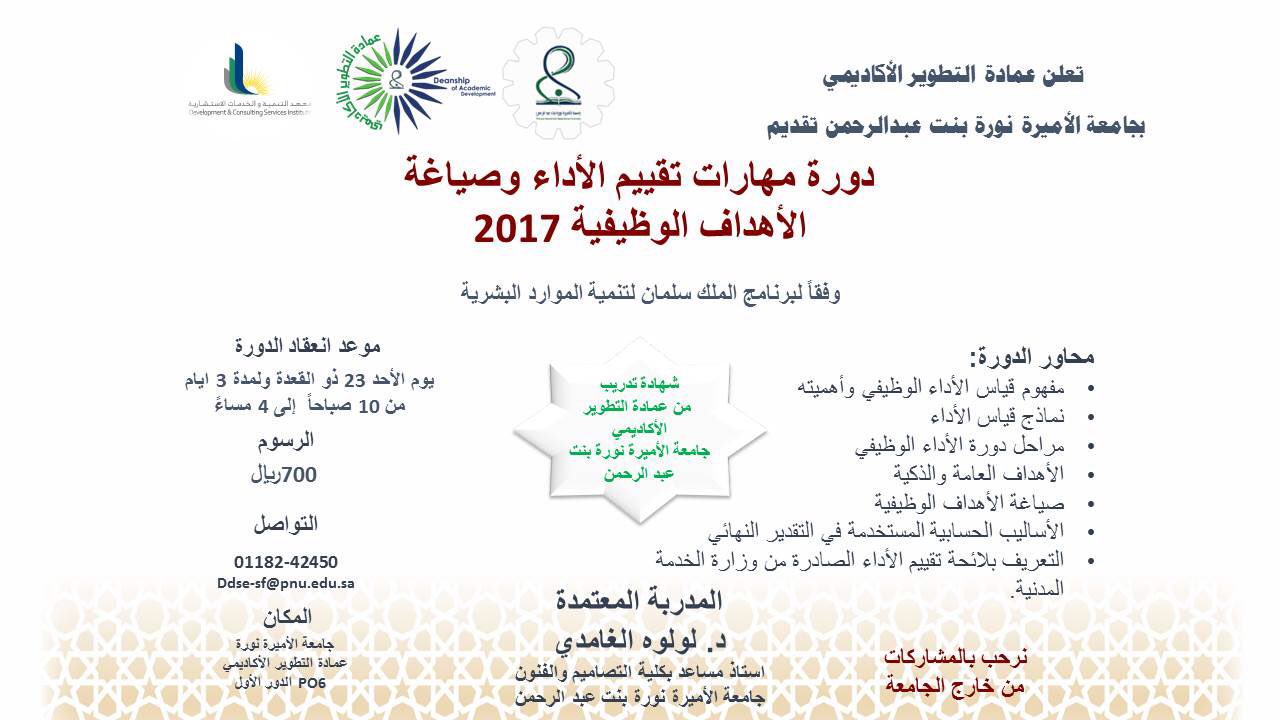 جامعة الأميرة نورة در توییتر إعلان من عمادة التطوير الأكاديمي عن دورة مهارات تقييم الأداء وصياغة الأهداف الوظيفية 2017 وفقا لبرنامج الملك سلمان لتنمية الموارد البشرية رابط التسجيل Https T Co 6os7nxu8gc جامعة الأميرة نورة Pnu Https T Co
