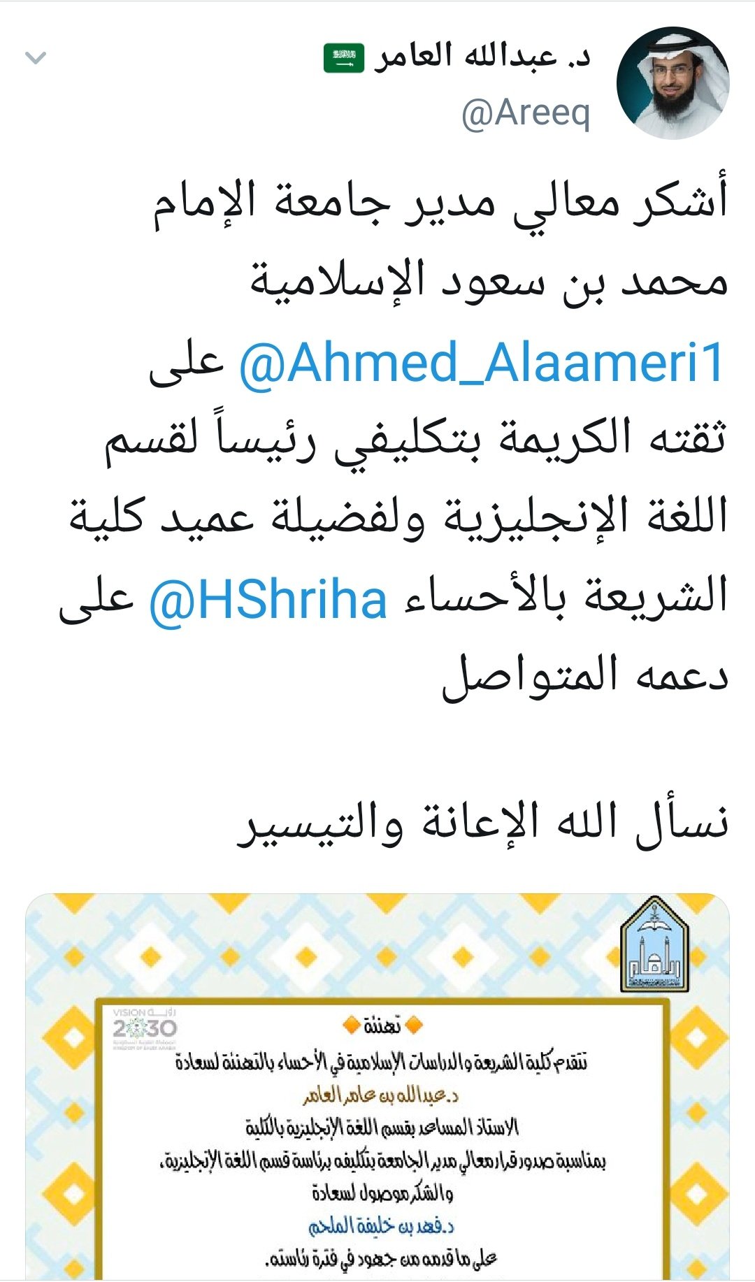 مجموعة نايف بن خالد On Twitter بسم الله نبدأ بالتعرف على الدكتور عبدالله العامر الذين كلف رئيسا لقسم اللغة الإنجليزية بجامعة الإمام من قبل مدير جامعة الإمام محمد بن سعود الإسلامية Https T Co Omtov8vy32