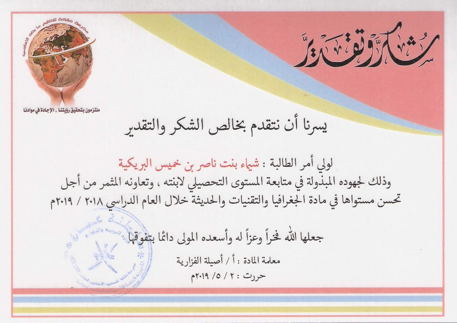 اجعل الجغرافيا أكثر متعة وفائدة شكر وتقدير لأولياء أمور الطالبات للعام الدراسي 2018 2019م
