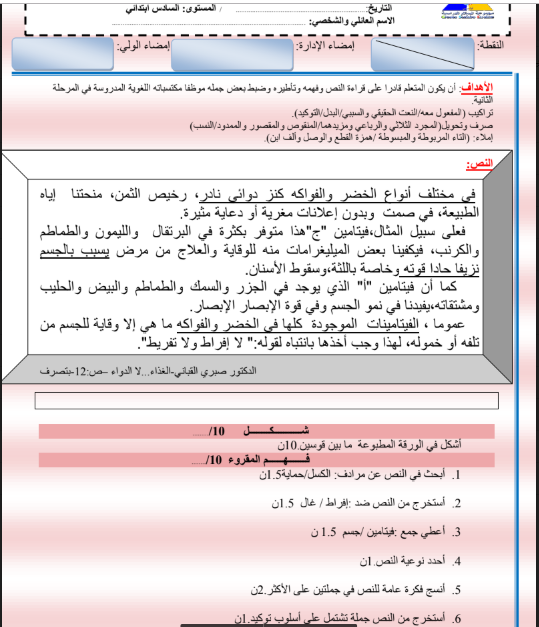 النموذج السادس للفرض الكتابي الثاني في مادة اللغة العربية خلال الدورة الأولى مستوى السنة السادسة ابتدائي