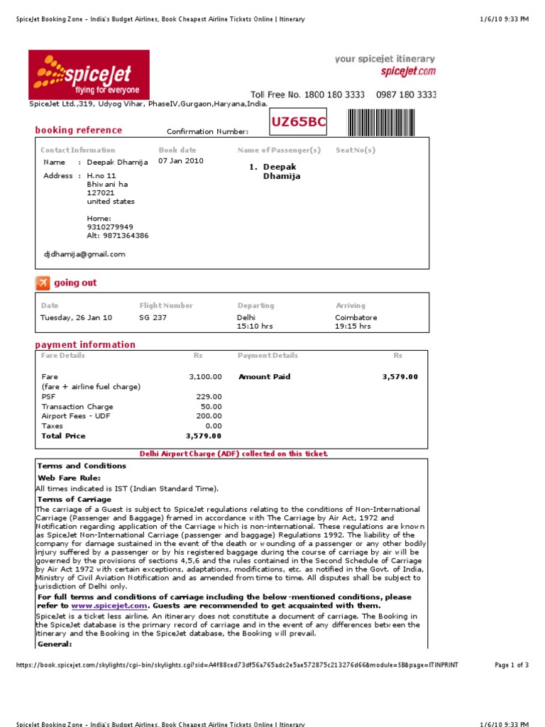 Spicejet Itinerary Baggage Identity Document
